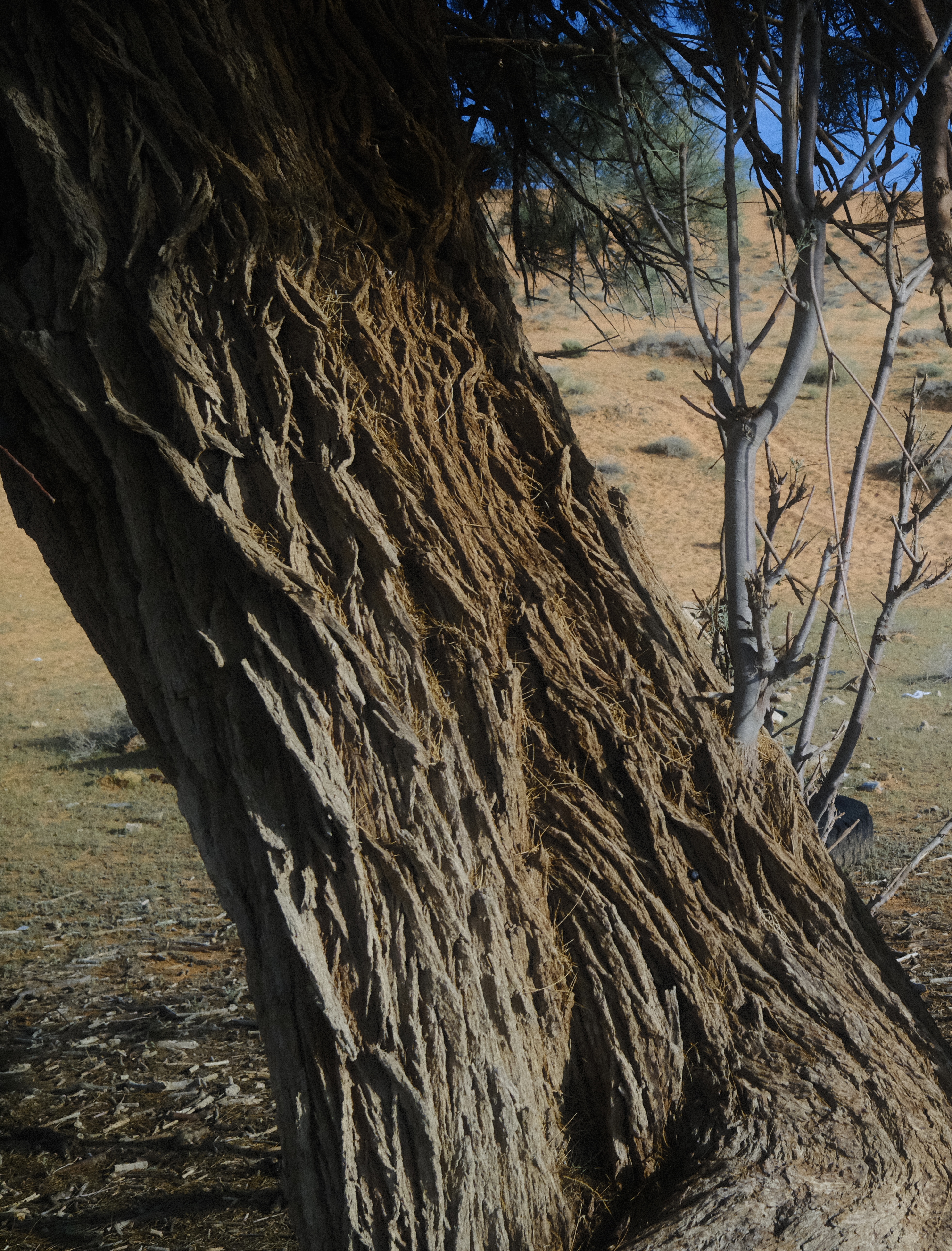 كان يقف ويمرر كفه الطويلة على الجذع العملاق، ثم يحضنه في محاولة لقياس عرضه بالحدس على الأقل ويعقد حواجبه كما لو أنه ضغط زر الحاسبة ثم يقول أن عمر الشجرة يقترب من الثمانين عاما أو جاوزها. يقول أن الأثل مساكن الـ «بسم الله الرحمن»، ويشير بعينيه في محاولة لتنبيهنا بالخليقة الخفية المتحلقة حولنا، ثم يقطف من ورقها الأخضر ويعصره حتى نرى الملح ويقول «شفتوا؟»، وتدور نظراتنا في حيرة حتى يمتعض من عدم فهمنا، وينطلق في شرح طويل ويقول أن الجن ليس كما نتصوره بل أن جني هذه الشجرة هو بحرٌ لجي مدفون في ظلمة أكبر أحلك من كل الليالي ولا يظهر منه في عالمنا إلا هذا الملح، ثم يمص الورقة، ويقول: أكلت الجنّي، ويضحك مقهقهًا مثل شرير في مسلسل كرتوني. الأصول الأولى للأثل غير معلومة وهناك تقديرات بأنها نشأت في وسط آسيا، ثم انتشرت ببطء في الربع الخالي الذي كان غابة ذات أنهارٍ جارية وأنعام، في وقت زالت الصحراء فيه تتقدّم ببطء من النفود الكبير شمالًا. لم أعرف عن هذه المعلومة إلا بعد بحث طويل عن ارتباط الأثل بالجن، الربع الخالي، الصورة الأولى والأوحد للصحراء في مخيّلتنا، هو آخر ما تصحّر في الجزيرة. تحوّل الأثل مع انتصار الصحراء من شجرة تسكن ضفاف الأنهار حصرًا، إلى كائن متوحّش ينشر الملح في التربة التي حوله ليطرد أي شجرة قد تنافسه في الوصول للمياه.